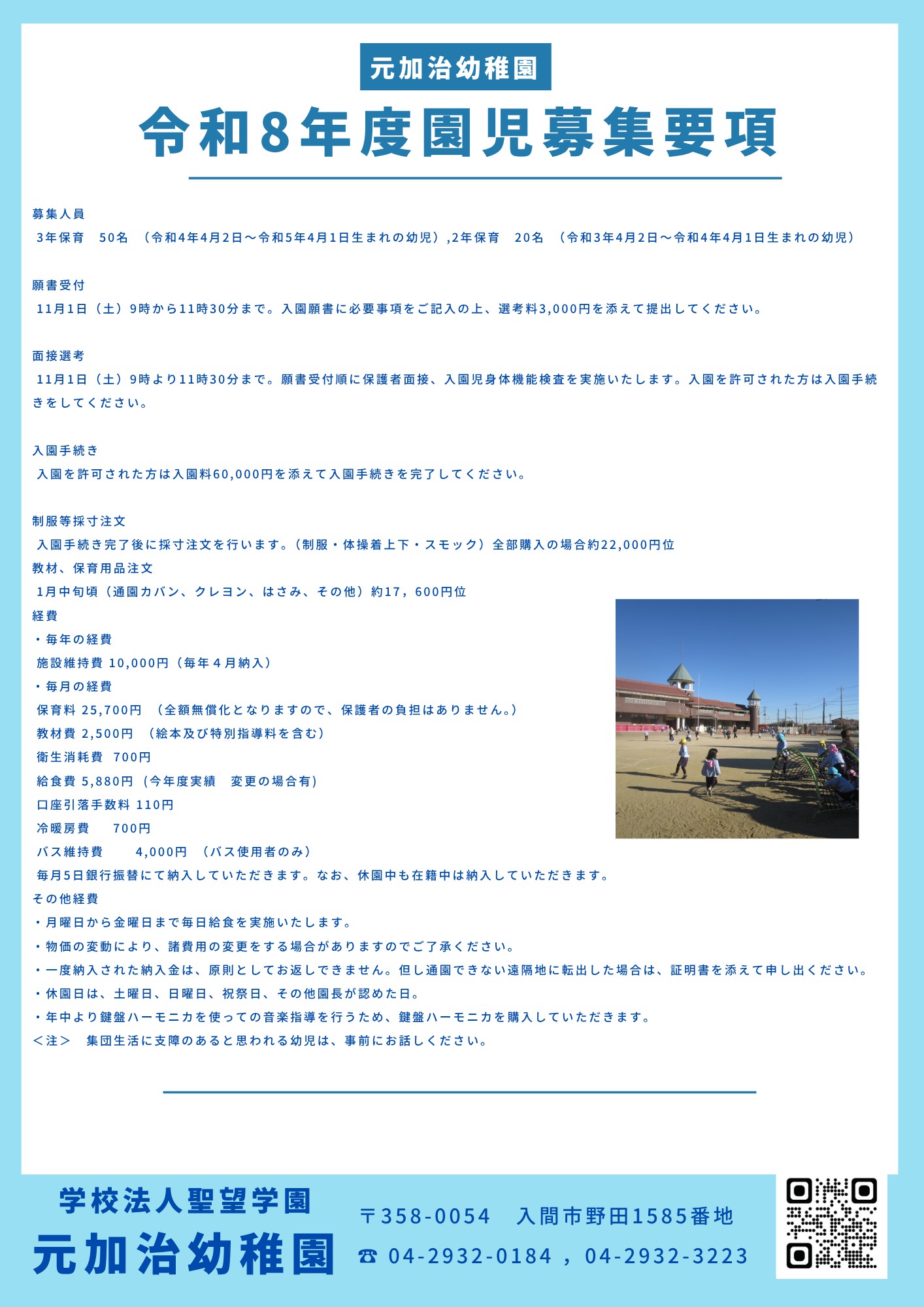 元加治幼稚園の案内チラシを掲載します。掲載の行事は2025年度実施の物です。元加治幼稚園では園の説明会や見学会を随時行っております。電話で予約申し込みをお願いします。予約電話 04-2932-0184