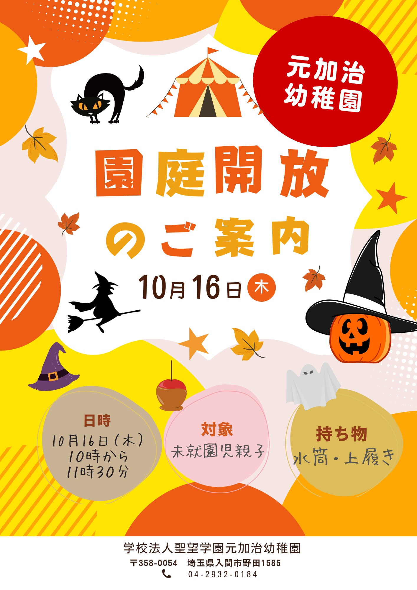 10月15日(水)より令和8年度新入園児願書配布を行います。祝祭日を除く平日午前8時30分~午後5時の間元加治幼稚園1階職員室受付で配布をいたします。なお、この指定した時間に願書を受け取りに来ることができない方は、お電話にてご連絡ください。連絡電話番号 04-2932-3223です。なお、11月1日(土)9時から願書受付を開始し、その後面接を行います。※元加治幼稚園では令和9年度から幼保連携認定こども園として新たにスタートする予定です。さらに令和8年度6月から新園舎への引っ越しも予定しています。