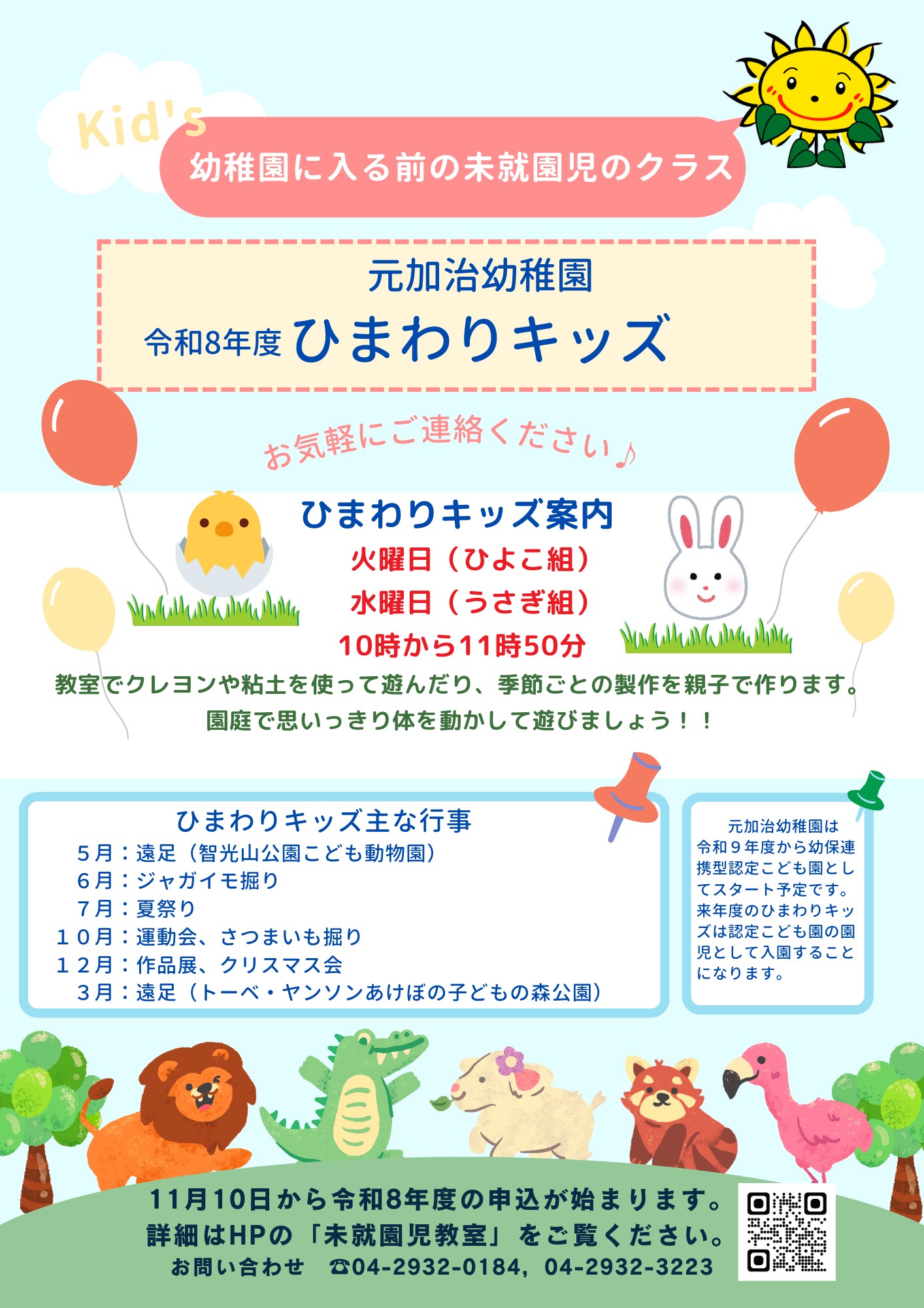 令和8年度未就園児クラス(ひまわりキッズ)の申し込みを2025年11月10日(月)より行います。募集要項や申し込み方法については、「未就園児教室」をご覧ください。※元加治幼稚園は令和9年度から幼保連携型認定こども園としてスタート予定です。ですので来年度のひまわりキッズはこども園になって最初の年少組さん入園になります。